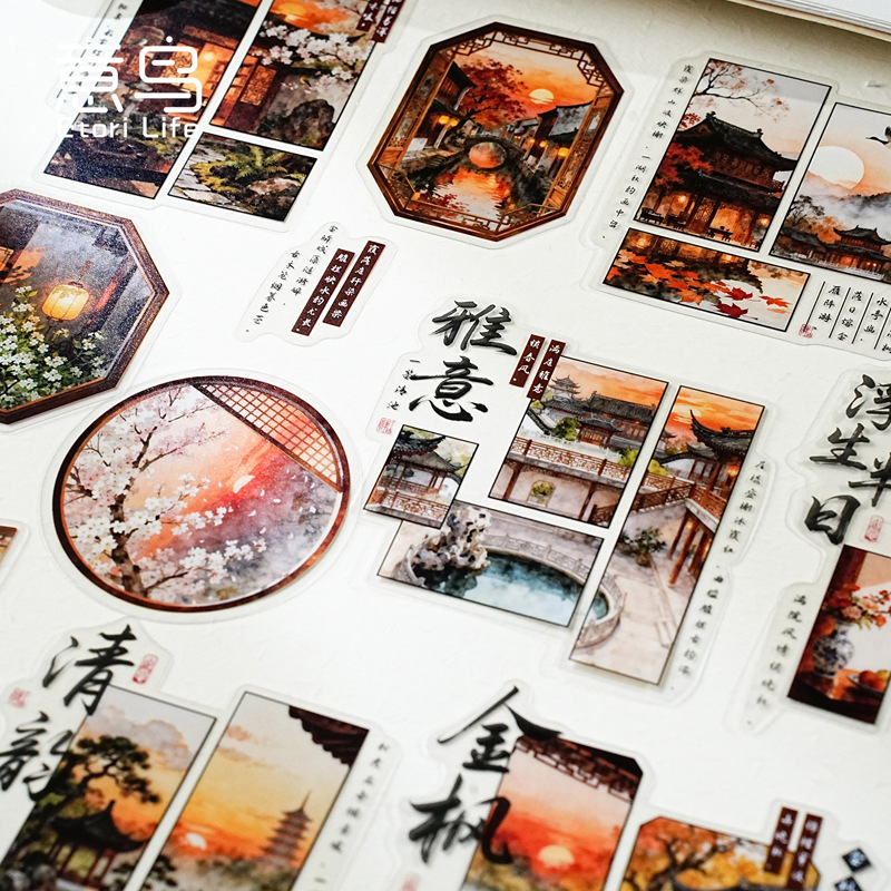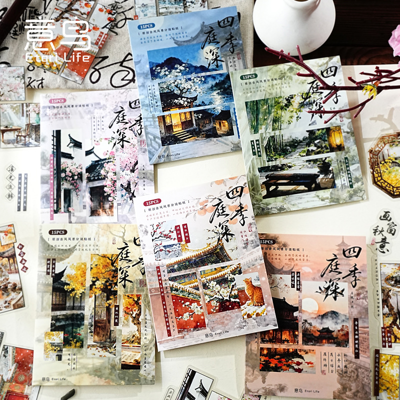 15Pcs Chinese Style Courtyard Theme PET Sticker Book