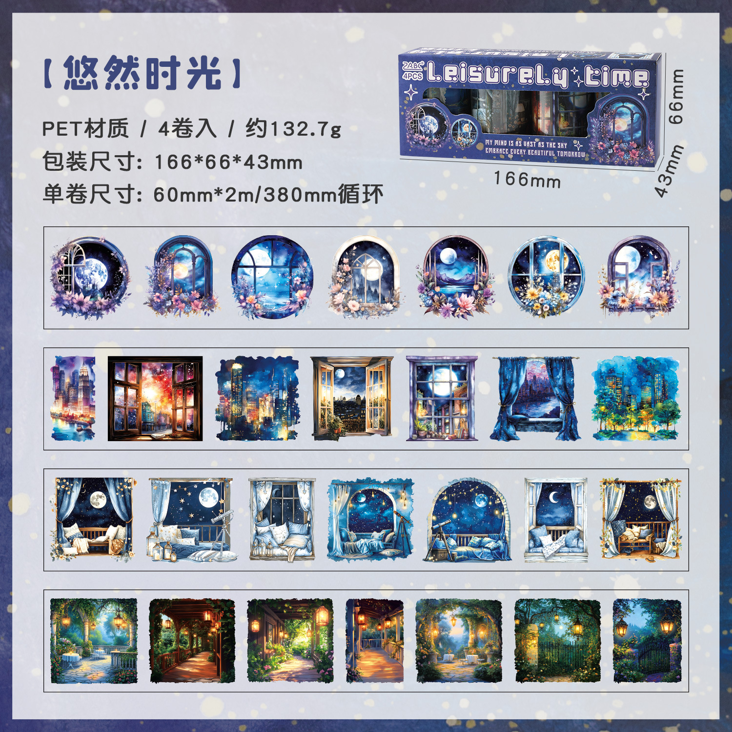 4 rolls of night starry sky themed PET tape set, 2.36 x 78.74 inches