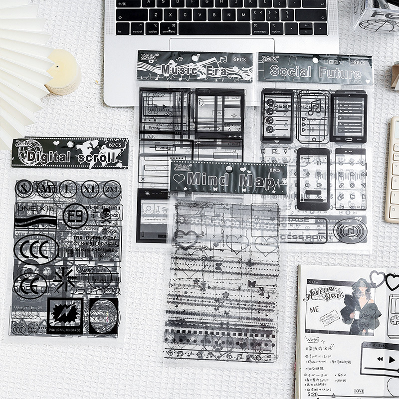 6Pcs Retro Black and White Collage Decorative PET Stickers
