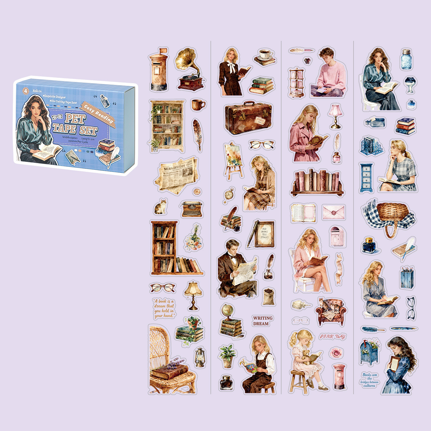 4 Rolls Vintage Literary Character PET Tape Set 1.57*78.74 inch