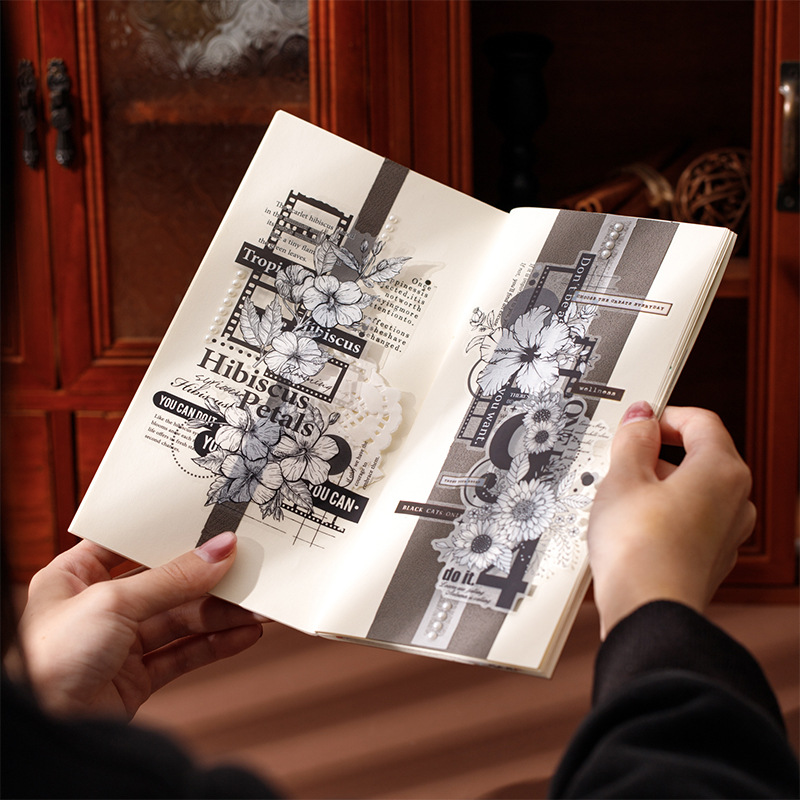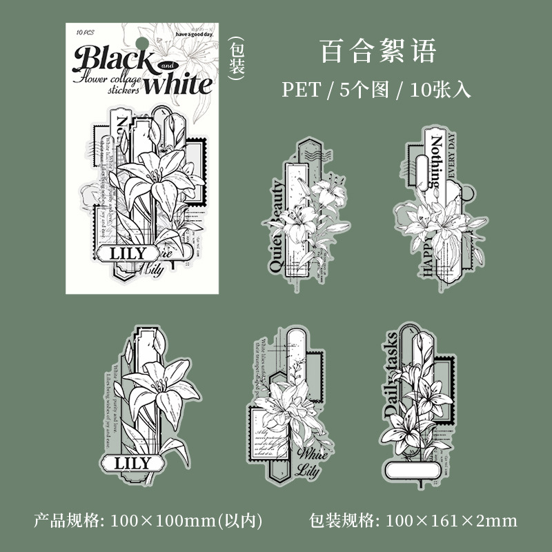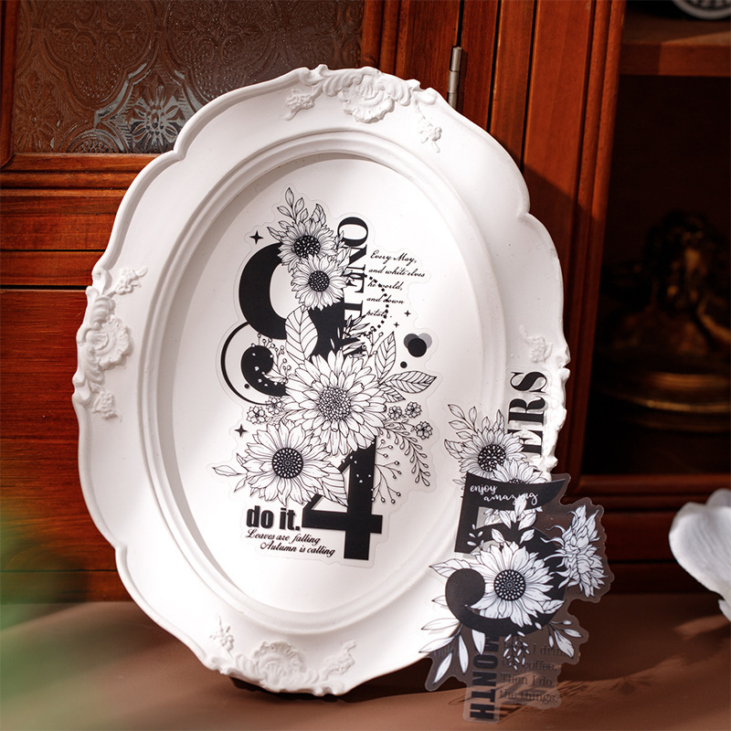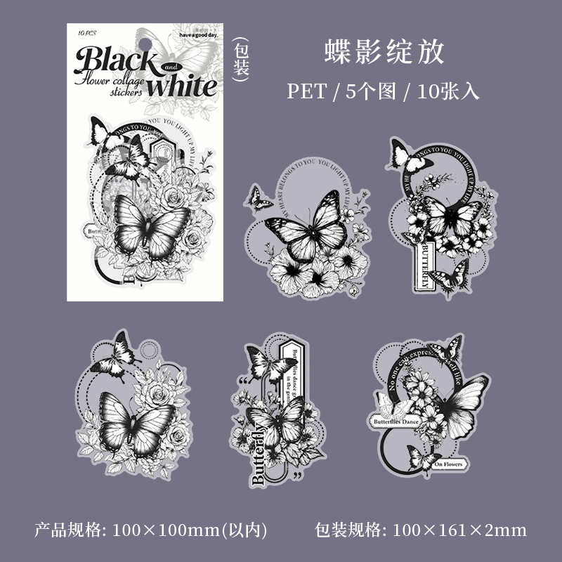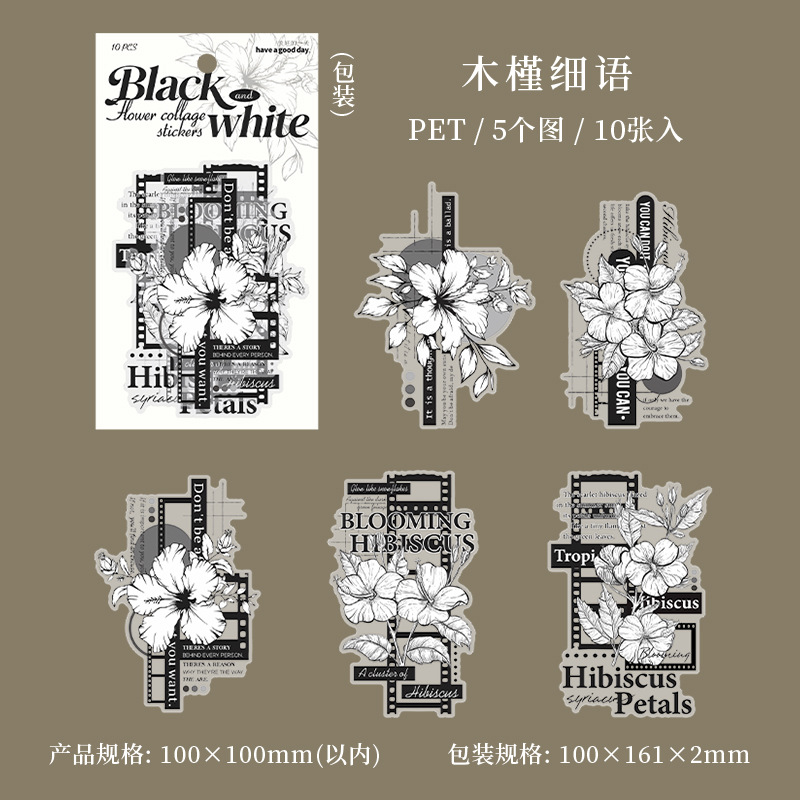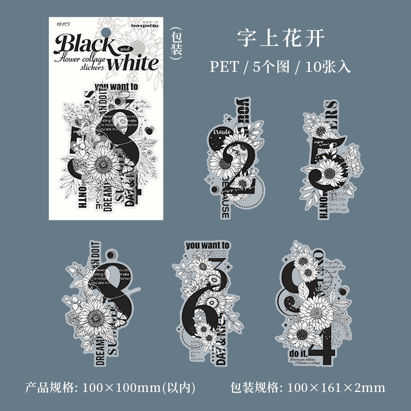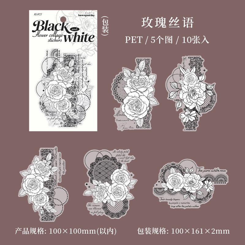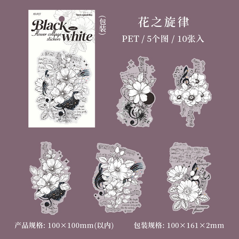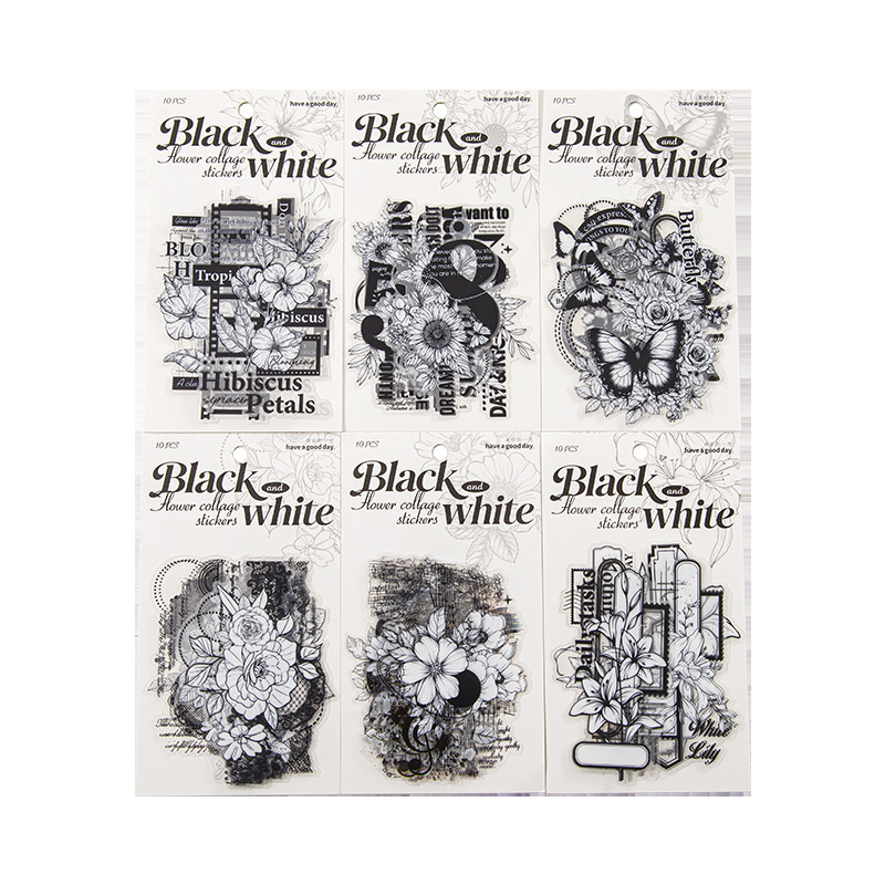 10Pcs Large Size Black & White Floral Theme PET Stickers