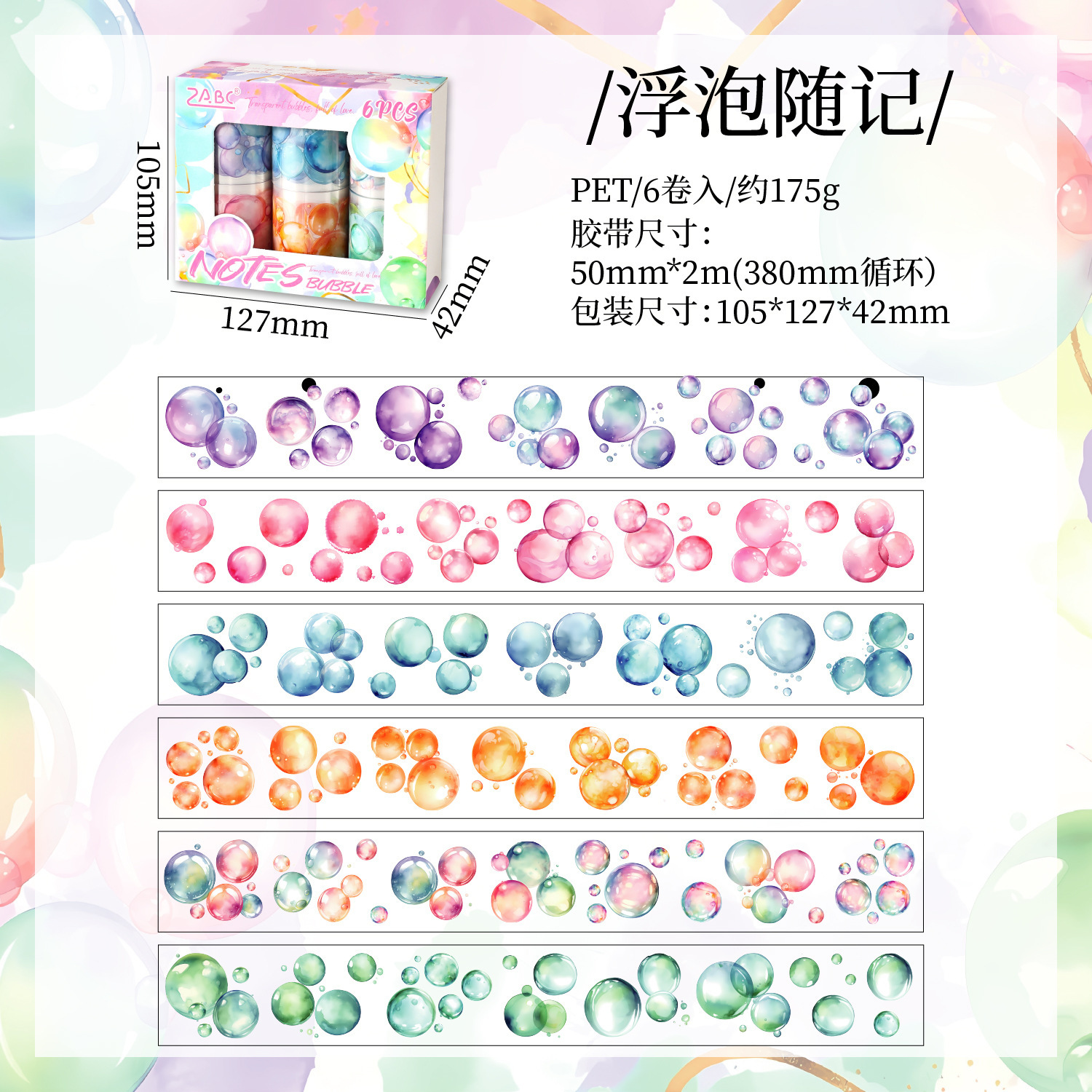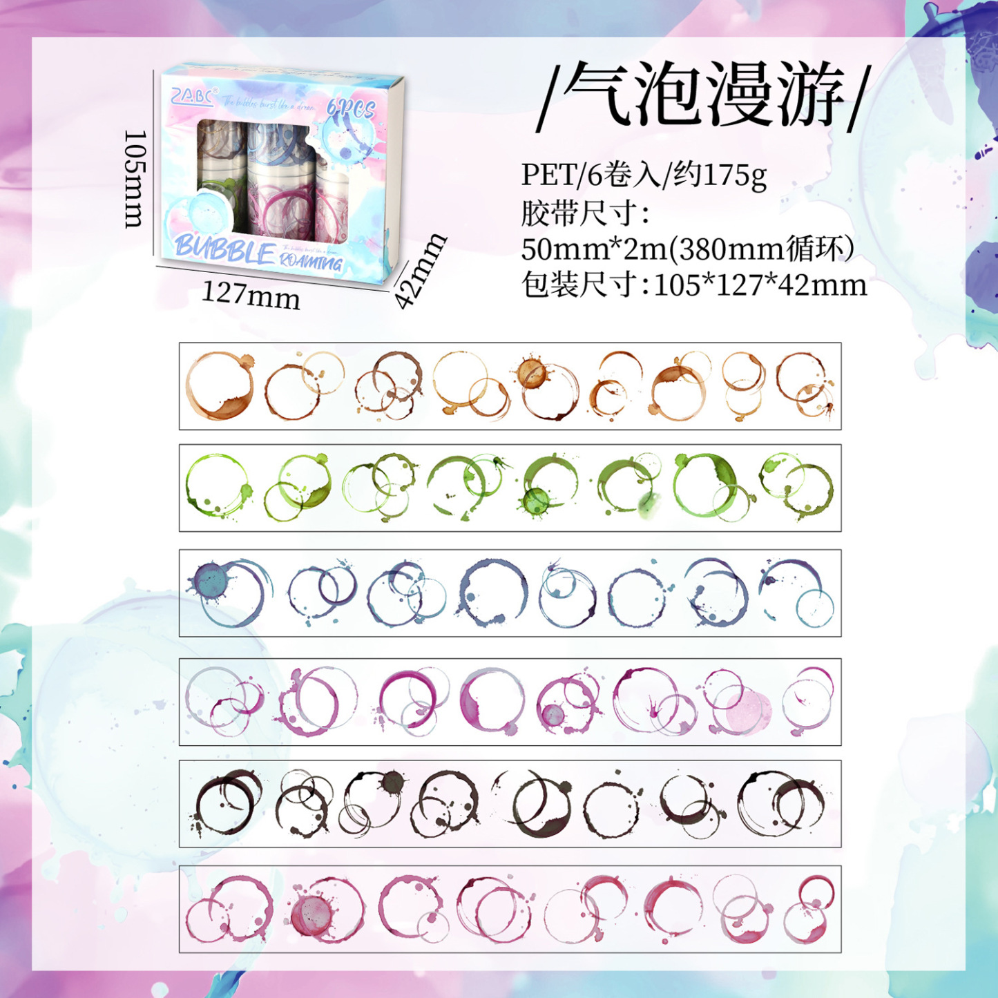 6 rolls of watercolor bubble theme PET tape set 1.97*78.74 inch